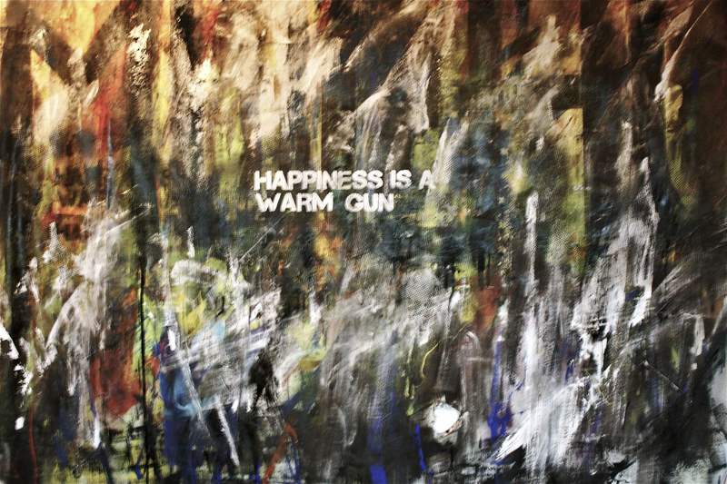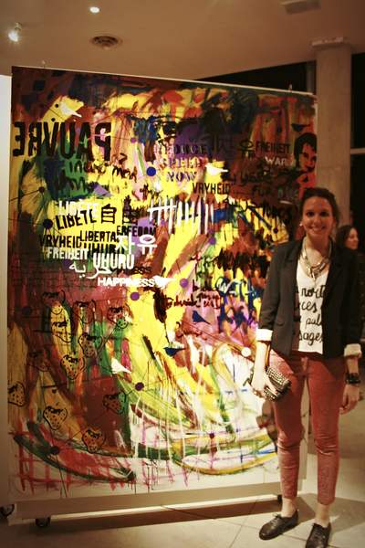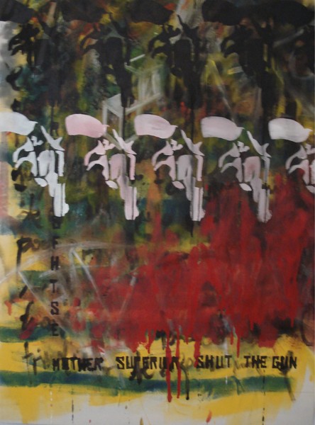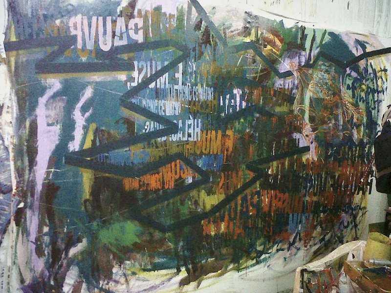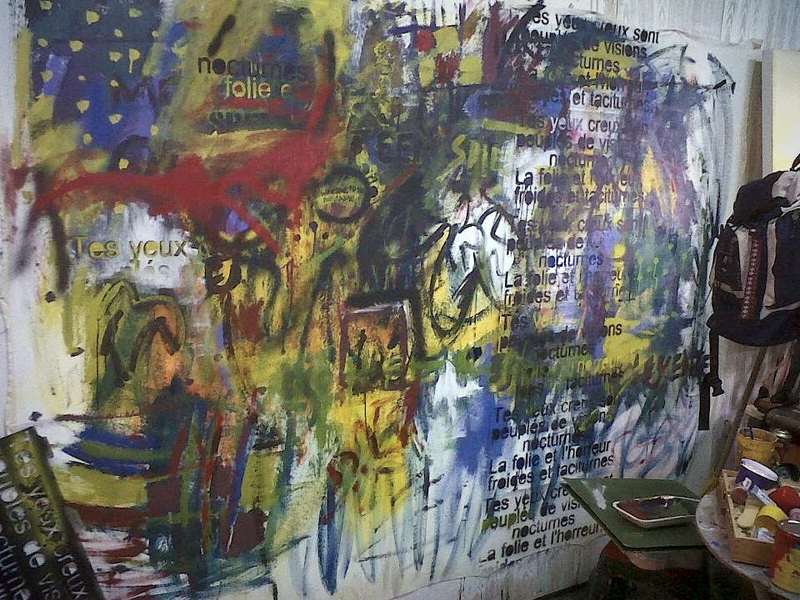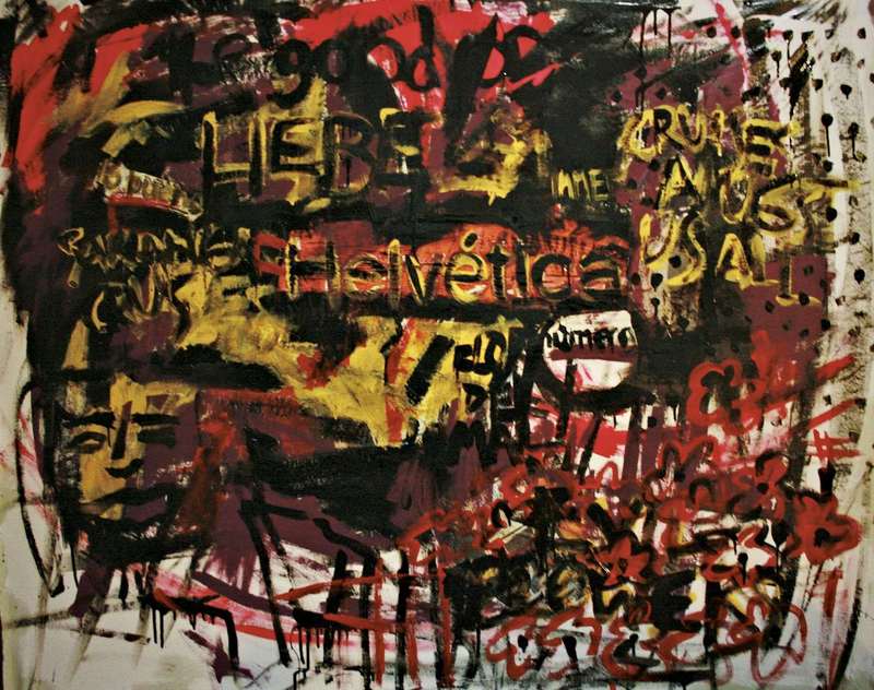 Y asi fue, tamaños enormes, que se devoran lo que tienen cerca, Grafismos y frases en idiomas inventados a veces, en francés, en alemán, en español, colores a rabiar, gestos corporales violentos, stenciles, que después de ser multiusados se transforman en piezas de museo de grabado, revisión de la historia que a ella le interesa e incluye fragmentos en sus composiciones, ver el perro de las ...