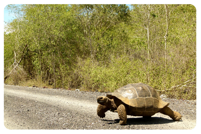 Encontre este Galapagos caminando y Galapagueando. Simplemente andando los caminos que tienen estas Islas Encantadas. La Fotografia congela el momento justo. El paso que esta por dar la Tortuga, como estira su pierna trasera, y como equilibra con la piern