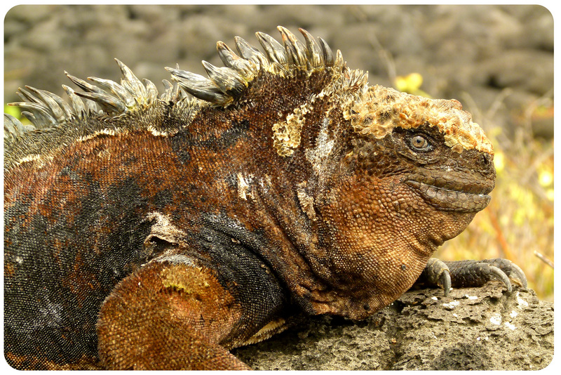 Iguana Marina de las Islas Galapagos, mostrandose imponente a la lente de la Camara. Existen miles de iguanas desparramadas por las Islas, todas de diferentes tonos de piel, que varian entre rojizo, anaranjados, marrones oscuros y claros y negros. Lo mas
